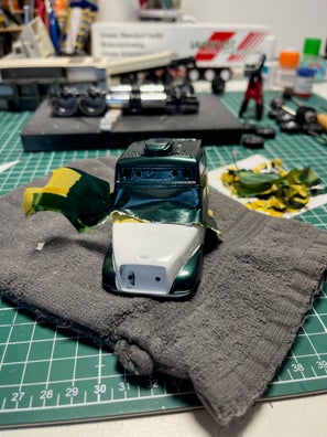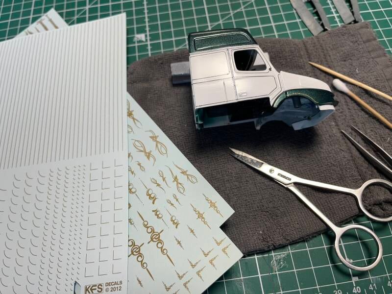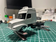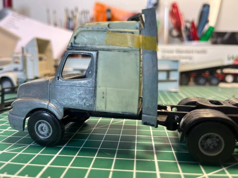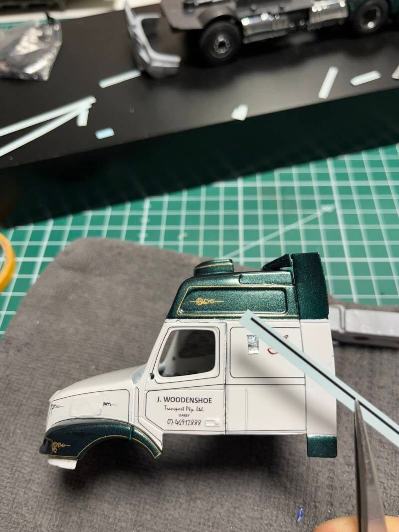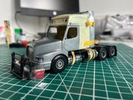 Combined a Lion Toys Volvo NH and a Volvo FH XXL resin cab from Tekno with a lot of other parts to build this Aussie truck. Spent a lot of time to get the pinstripes on.